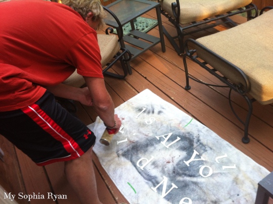 Rather than using stencils, I printed out my own letters using Georgia font (size 400). I was going to trace them on the drop cloth and paint the letters the same way I did the monogrammed pillows I made recently. My husband thought that sounded like too much work and suggested he spray paint the letters I had printed then glue them on the drop cloth. He talked me into and it ended up looking pretty good.