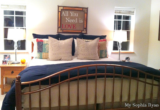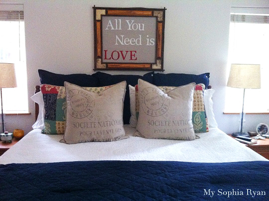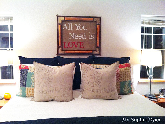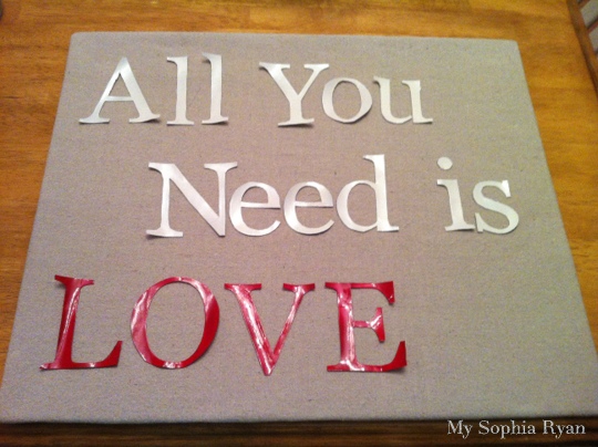 After the wedding, I decided I wanted to stencil “all you need is love” on drop cloth and use the frame.