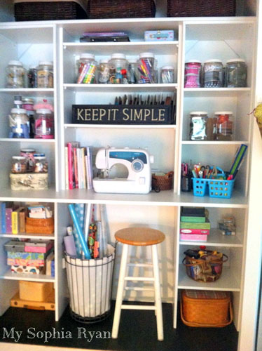 What a wonderful organizing job! You did a great job of not only storing your supplies, but making it look attractive too. I’m loving the magazine rack and the fact that you even have room for a sewing machine and stool. Amazing!