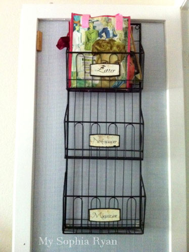 A decorative wire rack for magazines, letters, and paper is hung on the other door. We’re going to put cork on the inside of the doors to pin pictures up on.