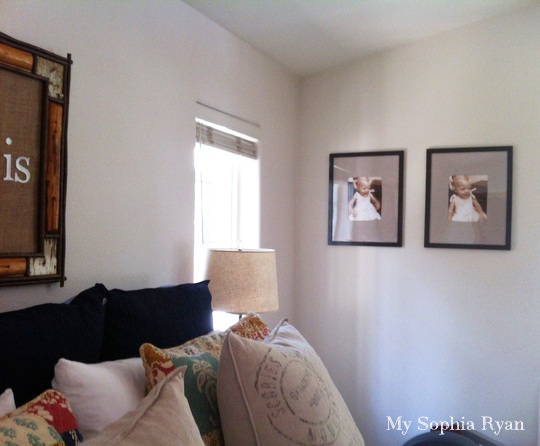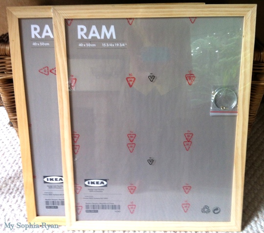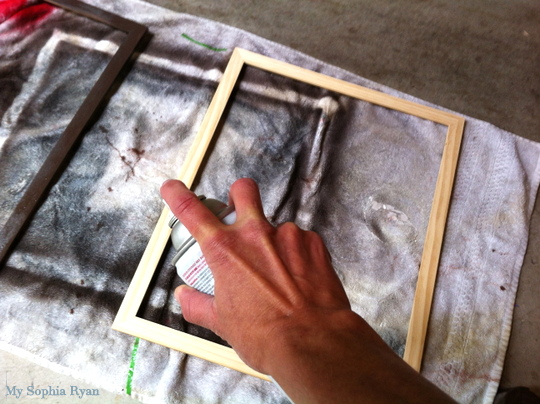 I used the same spray paint I used for the hamper basket makeover project. It is Rust-Oleum gloss protective French Roast.I sprayed the frames with 2 coats and allowed them to dry about 24 hours.